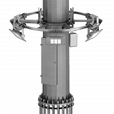 Высокомачтовая опора состоит из нескольких секций. Такая конструкция упрощает транспортировку и монтаж на объекте. Главная особенность мачт освещения с мобильной короной заключается в возможности опускания платформы с прожекторами для обслуживания без использования подъемной техники. Механизм спуска-подъема включает мощную электрическую лебедку, систему тросов и направляющих элементов, обеспечивающих безопасное перемещение короны по всей высоте мачты. Конструкция рассчитана на установку до 16 прожекторов общим весом до 400 кг.